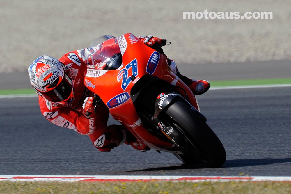 Hard on the throttle and showing those behind, the sponsors on the side of his Ducati, Casey Stoner slides his number 27 machine as he counts down the race meetings left with Ducati.